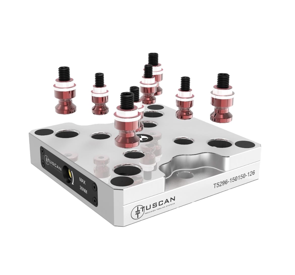 Same Location Studs: One of the key advantages of the Tuscan 52 | 96 system is that its location studs are the same as those used in 5th Axis workholding systems. This makes the Tuscan 52 | 96 fully compatible with existing 5th Axis fixtures, allowing you to easily integrate it into your current setup without the need for additional tooling or adjustments.